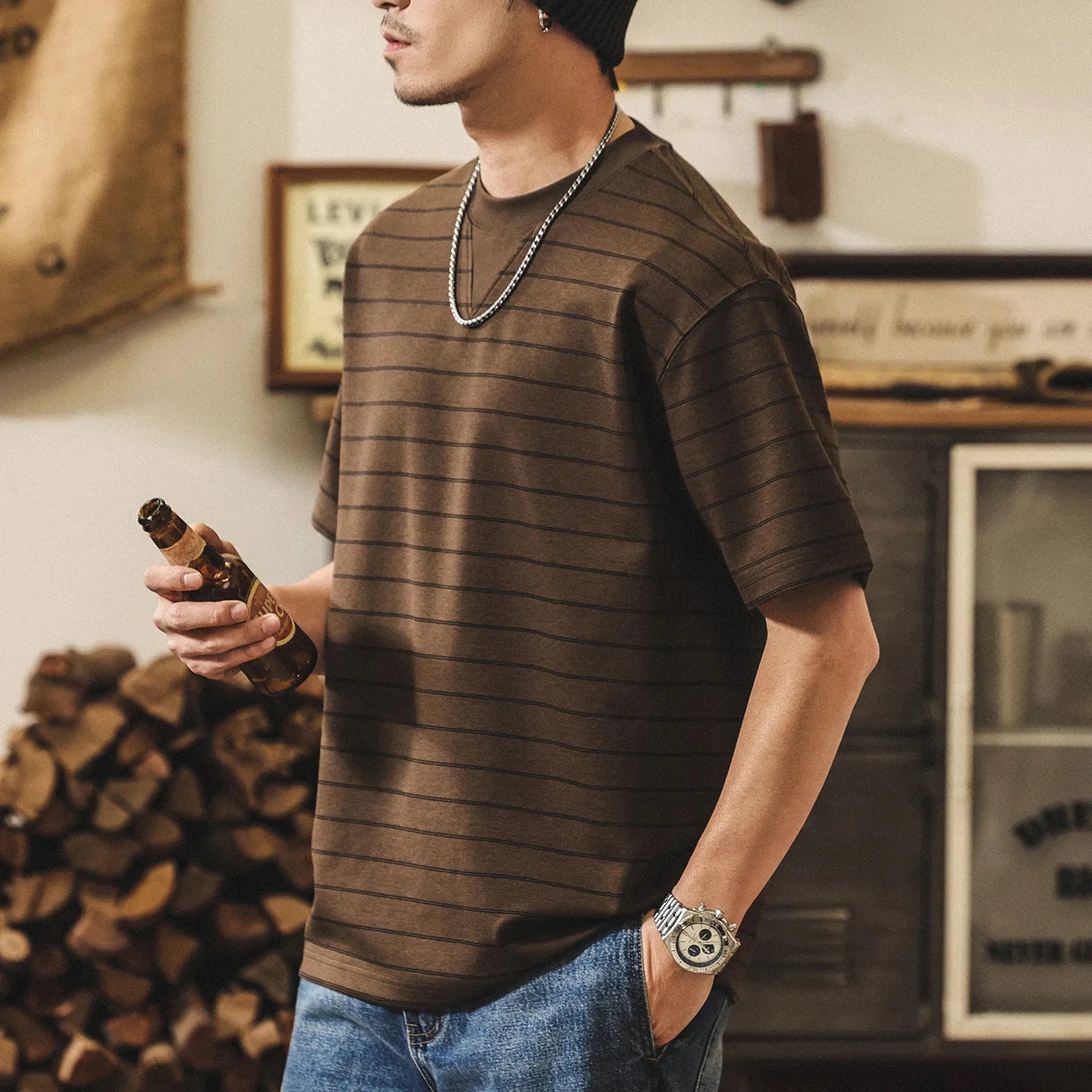 #BN-BNT8228-ST# American retro striped short-sleeved T-shirt